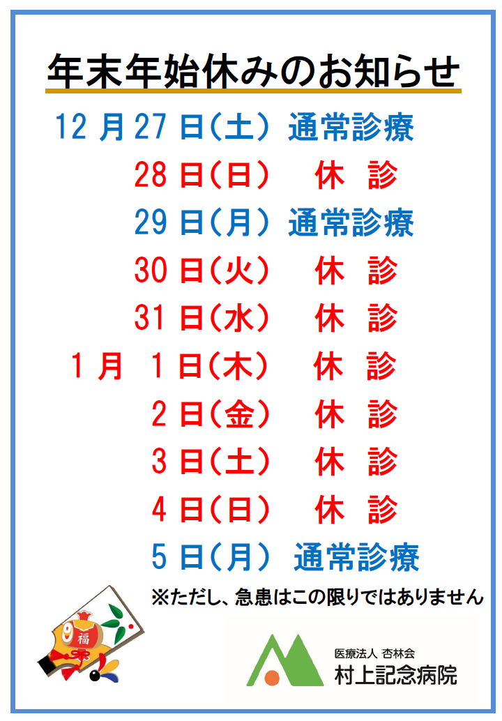 年末年始休診のお知らせ 2025 12/23 お知らせ 2025年12月23日 当院では、誠に勝手ながら下記の期間を年末年始の休診とさせていただきます。 休診期間:2025年12月30日(火)~2026年1月4日(日) 2026年1月5日(月)より通常診療を行います。 休診期間中はご不便をおかけいたしますが、何卒ご理解のほどよろしくお願いいたします。 お知らせ